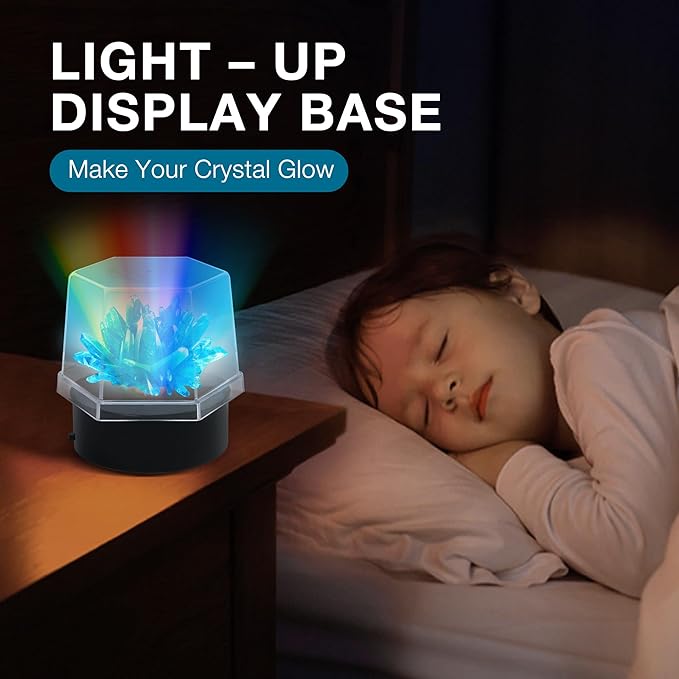 - CRYSTAL GROW KIT with NIGHT LIGHT UP STAND: Crystal growing kits for kids 9-12 come with an LED display base to show off your favorite home-grown crystals with the included light-up display; Transform grown crystals into dazzling bedroom decor that sparks nightly curiosity - cementing STEM passion beyond the experiment