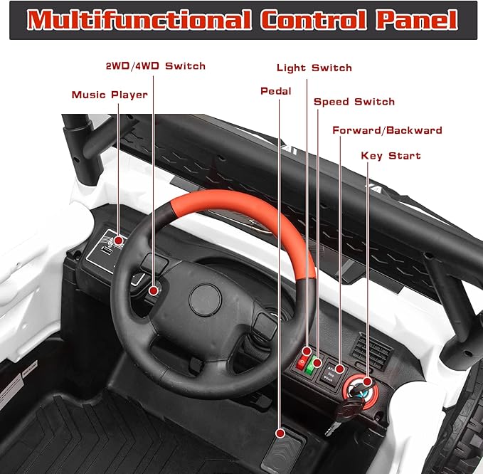 - REALISTIC DRIVING EXPERIENCE- This kids ride on truck has key start design, bright LED lights, horn &engine sounds, adjustable seat belt, lockable doors, foot pedal acceleration, wear-resistant wheels and cool decoration for off-road style, which can attract your kids at first sight