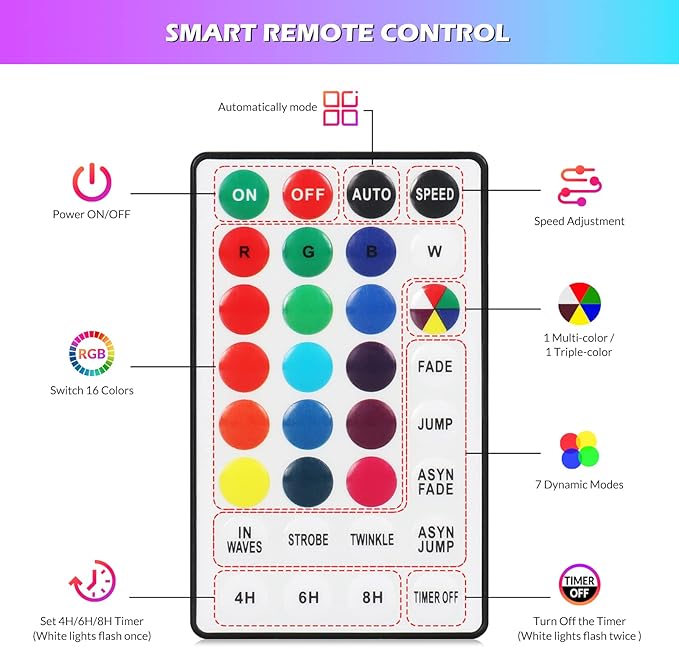 - MULTIFUNCTIONAL REMOTE---With the remote you can turn the indoor string lights on and off, choose from 16 vibrant colors, set the lights to different display options and set a timer for 4 or 8 hours to cancel the timer sim. You can also press the button on the controller to cycle through the colors and modes in case the remote get lost.