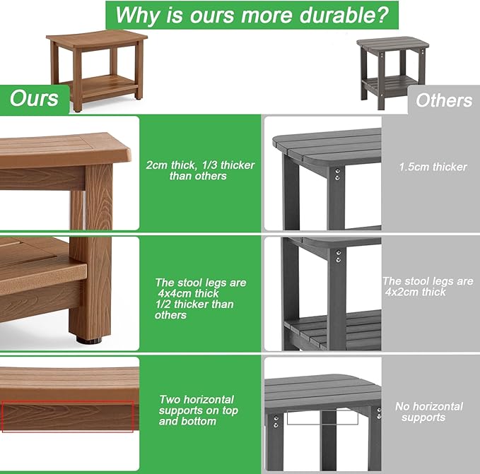 - 【Material & Size】This shower bench is made of polystyrene, it looks like real wood from out look, but actually it's a heavy duty plastic, , no splinters and no maintenance ( 21.3 x 14 x 17.3 Inches).