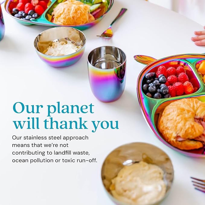 - Created with Parents in Mind — Our rainbow kids plates and bowls sets are easy to clean, dishwasher safe, stackable, shatterproof, with no risk of peeling. All Ahimsa toddler plates and stainless steel kids dishes are plastic free and free of BPA (and all bisphenols), PVC, phthalates, lead, siloxanes, melamine and formaldehyde, making them a favorite for parents, combining saftety and fun with a rainbow deisgn that promotes healthy, balanced meals.