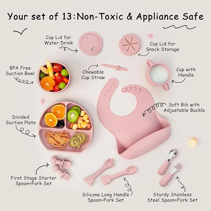 - đ„Łă13 pcs Set Contains Everything Your Baby NeedsăThis Silicone baby feeding set contains a 4-compartment suction plate, suction bowl, straw sippy cup with 2 lids, adjustable weaning bib, and 3 sets of fork and spoon for different stages. This silicone baby feeding set has everything your baby needs to eat independently.