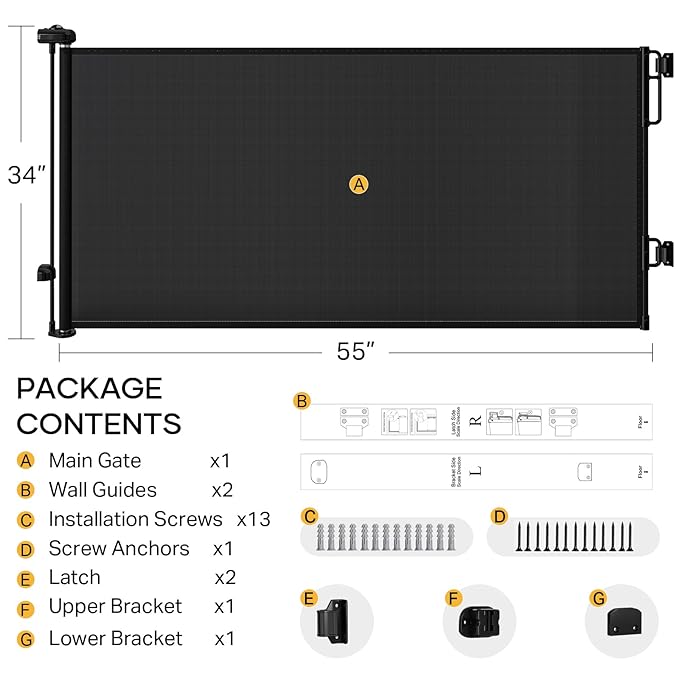 - Easy Hardware Installation: With the tools provided, you can have your new mesh retractable gate installed in minutes. Brackets, wall anchors, and screws make installation a hassle-free process. (Note: Not suitable for metal surfaces. When mounting to drywall, always anchor the screws into a stud for a secure and safe installation.)