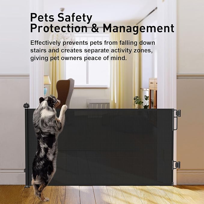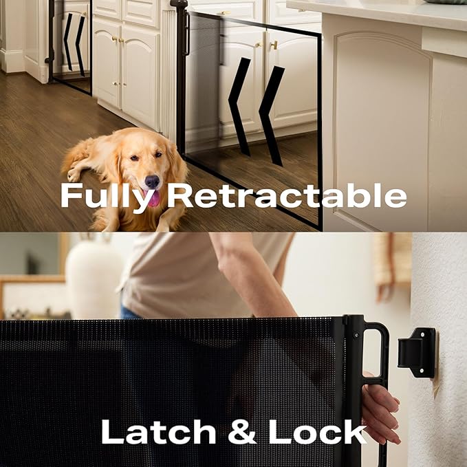 - New Safety Locking: The knob at the top of the mesh gate ensures that the retractable pet gate is easy to use for adults and can be opened and closed with one hand, while curious babies and pets will not be able to make any naughty bids for freedom. For best performance, remember to lock the latch after installation to fully tighten the mesh and ensure stability