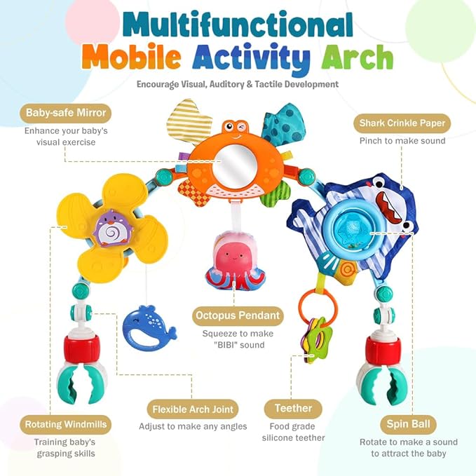 - Fun Play to Keeps Baby Busy:Our car seat toys is an ocean animal theme early development toys. The windmill will spin by little hand grasps and pulls down the whale handle. Detachable octopus hanging toy will make BIBI sound by squeezing. Also crab mirror,crinkle shark with rattling ball will attract your baby's attention and they will not boring at home or traveling.