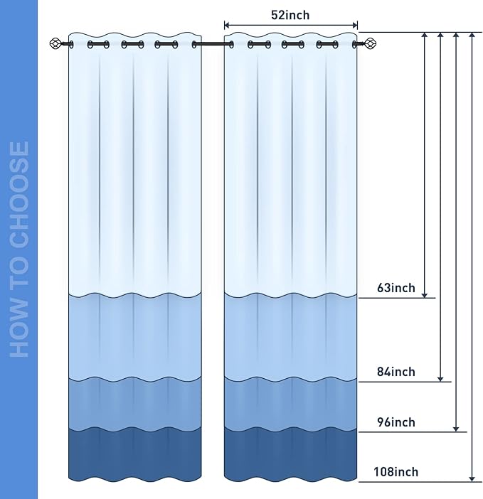 - Package Includes: Set of 2 Blackout Curtains Panels; Each panel measures 52" wide x 84" length with 8 grommets top each. Quality fabric feels soft and heavy.