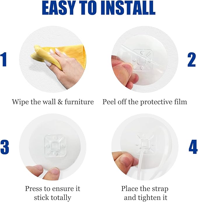 - 【Drill-Free Furniture Wall Anchor】Ensure home safety without the need for drilling. These furniture anchors are easy to install and remove. Simply clean the wall and furniture surfaces, peel off the protective film, firmly attach them to a flat, non-porous surface for a secure fit, and then tighten them with the anti-tip nylon straps. When removed, these wall anchors won't leave sticky residue behind