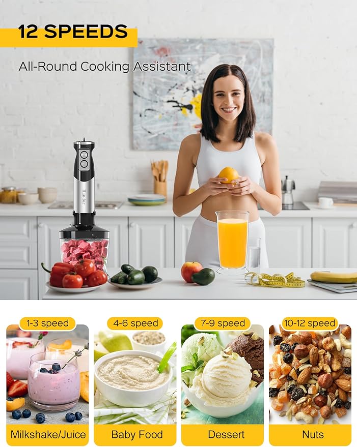 - 【12-Speed Adjustable】Professional 12-speed variable speed hand blenders, you can easily adjust the speed and power according to different foods. The TURBO button instantly reaches maximum power for better results.