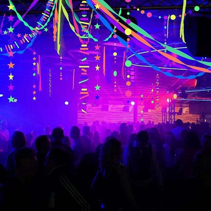 700ft Neon Paper Garland Glow in Dark Paper Streamers UV Reactive Round Dot Star Kit Banners for Neon Party Supplies, Wedding Decorations, Birthday Parties