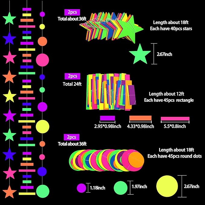 - 【What you can get】Package Include: 604Ft/6 Rolls long Fluorescent streamers (6 colors in total);36Ft/2pcs Round dot neon paper garland; 36Ft/2pcs Five-pointed Star neon garland; 24Ft/2pcs Rectangle Glow Strip; which is sufficient for glow in the dark party supplies.