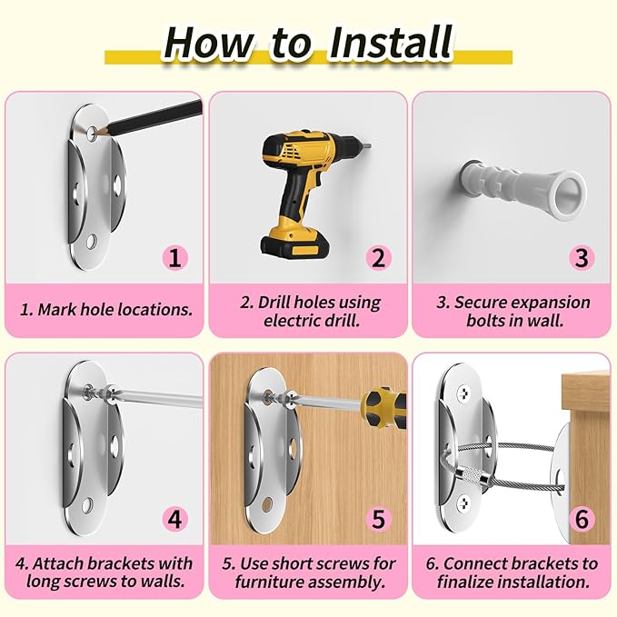- Easy Installation: Achieve dresser and large furniture security within minutes using our user-friendly anti-tip furniture straps. Follow the provided instructions, employ the included hardware, and effortlessly install using a screwdriver and drill driver. Opt for vertical or horizontal mounting, potentially saving a life.