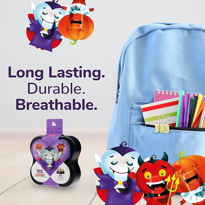 BioSwiss Bandages, Halloween Ghouls Shaped Self Adhesive Bandage, Latex Free Sterile Wound Care, Fun First Aid Kit Supplies for Kids and Adults, 50 Count