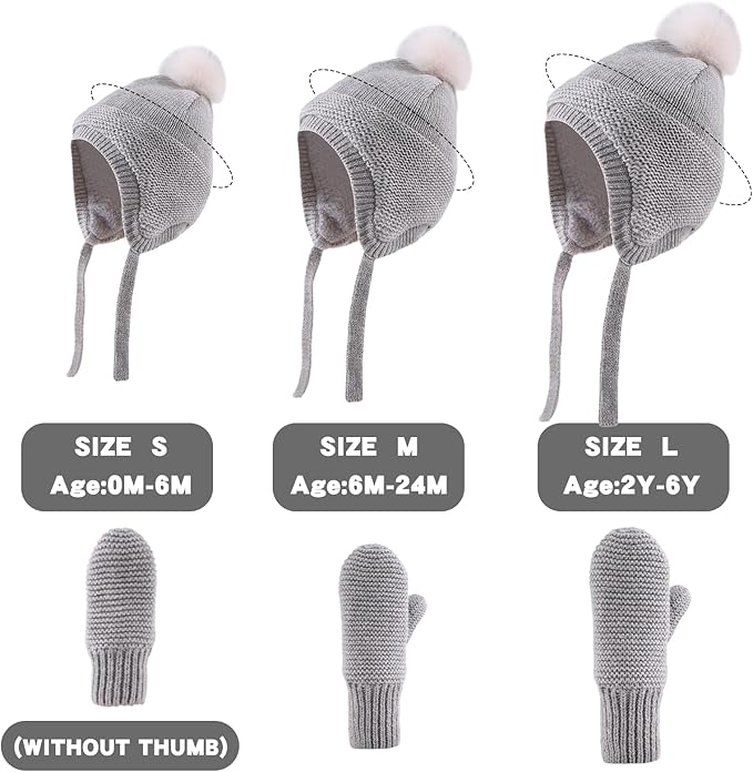 - SIZE CHART: Our children's beanie hats with pom and mittens set comes in 3 different sizes. The small size is suitable for infants aged 0-6 months, the medium size is perfect for toddlers aged 6-24 months, and the large size is designed for kids aged 2-5 years old. The fleece-lined fabric of the hat provides excellent stretch and heat retention, allowing each size to accommodate a wide range of ages. Please take note that the gloves of small size without thumb holes.