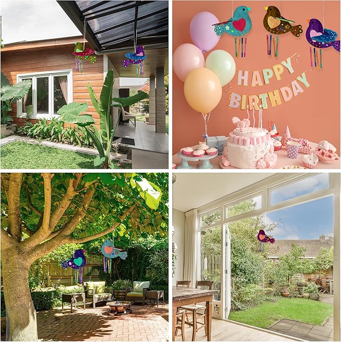 - COMPLETE DIY CHIME KIT: A set with enough accessories to create 8 melodic wind chimes! It includes 12 paint pots, 2 paint brushes, 1 rhinestone flower sticker sheet, 1 glitter heart foam sticker sheet, 32 metal chimes, 8 meters of silver string, and 8 wooden birds.