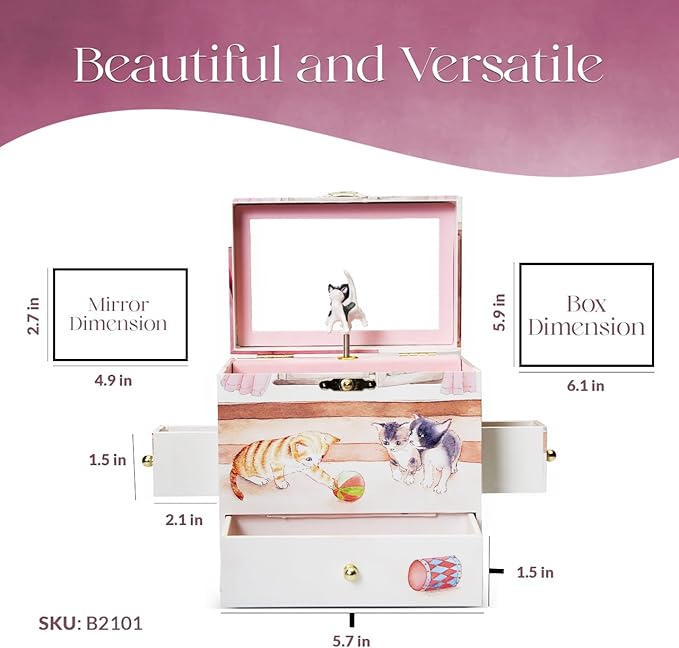 - 🧶 MULTI-FUNCTION: Not just a beautiful music box, this enchanting item contains multiple drawers to store trinkets and jewelry, seamlessly combining aesthetic allure and practical functionality. Our musical jewelry box measures 6 x 4 x 6 in. with 1 big compartment & a few hidden small drawers. This provides ample space to store all jewelry items and precious treasures in one place, creating a safe home for memories to be kept. You’re not just giving a jewelry box with a dancing kitty cat - you are encouraging organizational skills that any child will hold onto for years to come.