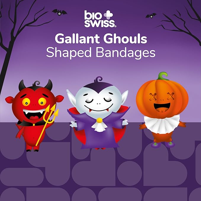 BioSwiss Bandages, Halloween Ghouls Shaped Self Adhesive Bandage, Latex Free Sterile Wound Care, Fun First Aid Kit Supplies for Kids and Adults, 24 Count