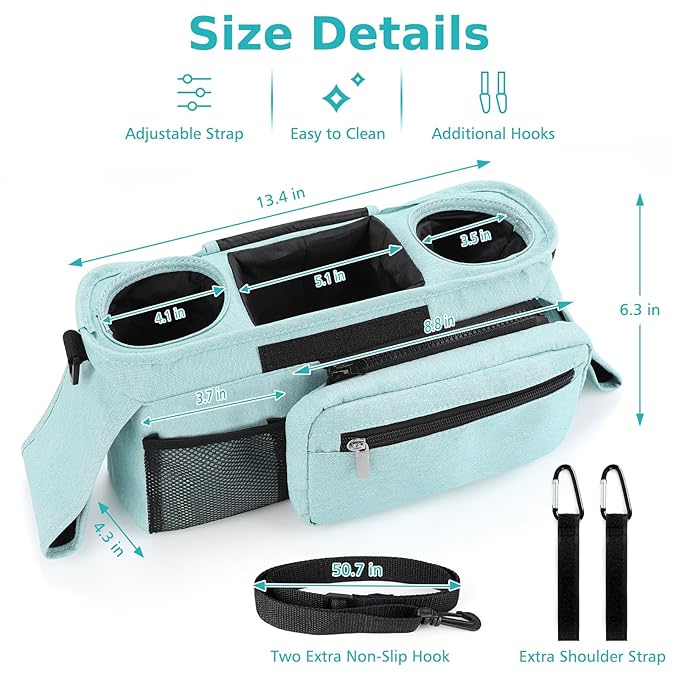 - Multiple Usage Methods : It can be hung as a stroller cup holder organizer on the stroller. When you don't need to use a stroller, you can also install the accompanying strap and carry this organizer bag for easy outing.