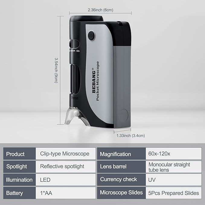 BEBANG Pocket Microscope,60X-120X Handheld Mini Microscope for Kids with LED Lighted Zoom, Portable Microscope Kits with 5 Pcs Slides for Adults Microbiological Observation Preschool Home Study Gifts