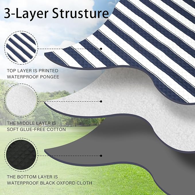 - 【Soft and Durable with 3-Layers】The picnic blanket top layer is printed waterproof pongee, the middle layer is soft glue-free cotton, and the bottom layer is waterproof black Oxford cloth. Perfectly suitable for siting or lying on grass, beach, floor or any kindly of surface, giving you soft and comfortable feelings.