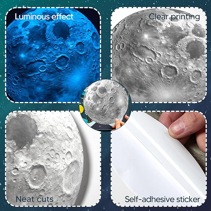 - Robmoda Glow in The Dark Planet - One piece of moon sticker made up of non-toxic, eco-friendly, waterproof, pressure resistant, shock resistant& durable fluorescent PVC. It comes in 23.5 cm (9.25β).