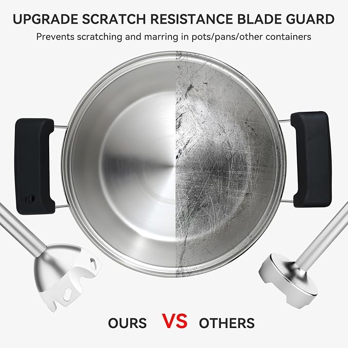 - THOUGHTFUL SCRATCH RESISTANT FEATURE & SAFE: The upgraded hand blender scratch-resistant blade guard design specifically protects non-stick cookware, allowing you to choose any of your pots or pans and no more worry about scratching them. The blender combo is made of BPA-free plastic and 304 stainless steel which is safe, healthy and long lasting.