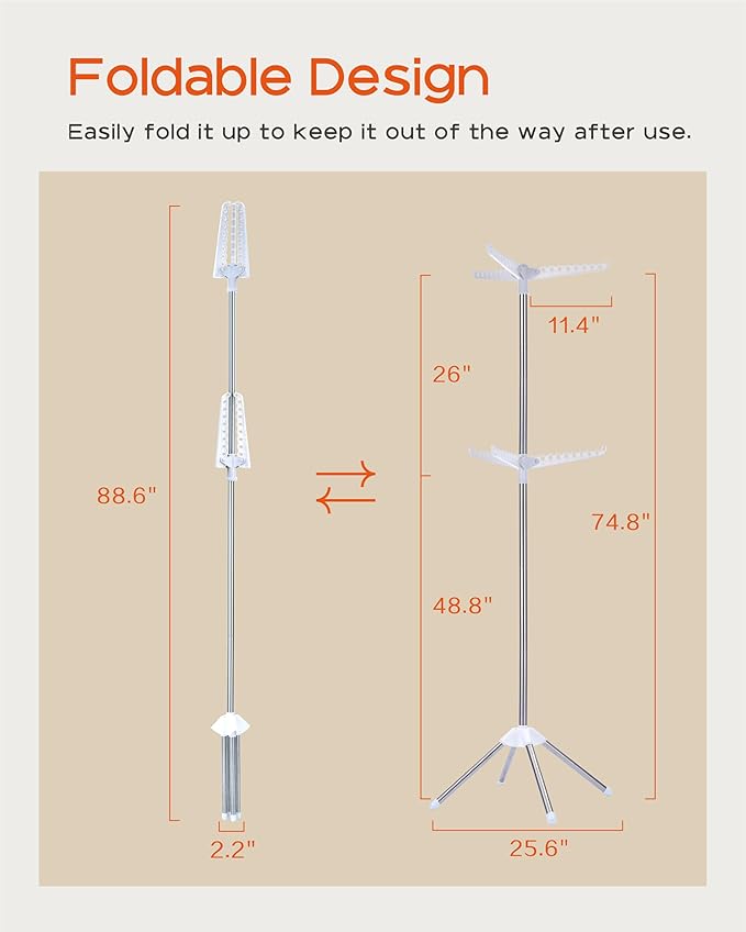 - [Foldable and Space-Saving] This vertical drying rack measures 25.6”D x 25.6”W x 74.8”H and takes up very little space. After use, simply fold the four legs and three drying rods into a smaller size: 2.2 "D x 2.2 "W x 88.6H, which can be leaned against the footrest, perfect for apartment laundry rooms or narrow spaces and corners.