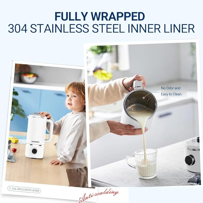 - SHARP BLADE & POWERFUL MOTOR - Soymilk Maker's 4-leaf steel blade with 10000r/min high speed and large torque motor, realizing dry beans straight to beat, the finished soymilk taste smooth, no need to filter. Comes with a cleaning brush for easy cleaning to protect your hands from injury.