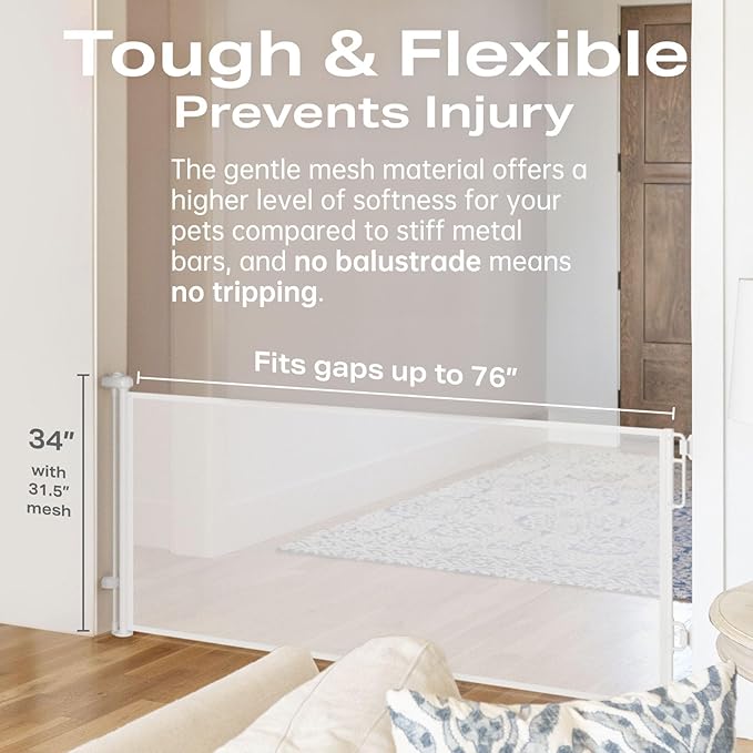 - Expandable Size: Our retractable gate extends up to 76" Extra wide and is 34" tall.The Cumbor mesh dog gate conveniently rolls up when not in use, making it easy to convert the room into an adult-friendly space again