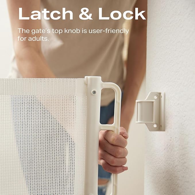 - New Safety Locking: The knob at the top of the mesh gate ensures that the retractable pet gate is easy to use for adults and can be opened and closed with one hand, while curious little ones and pets will not be able to make any naughty bids for freedom