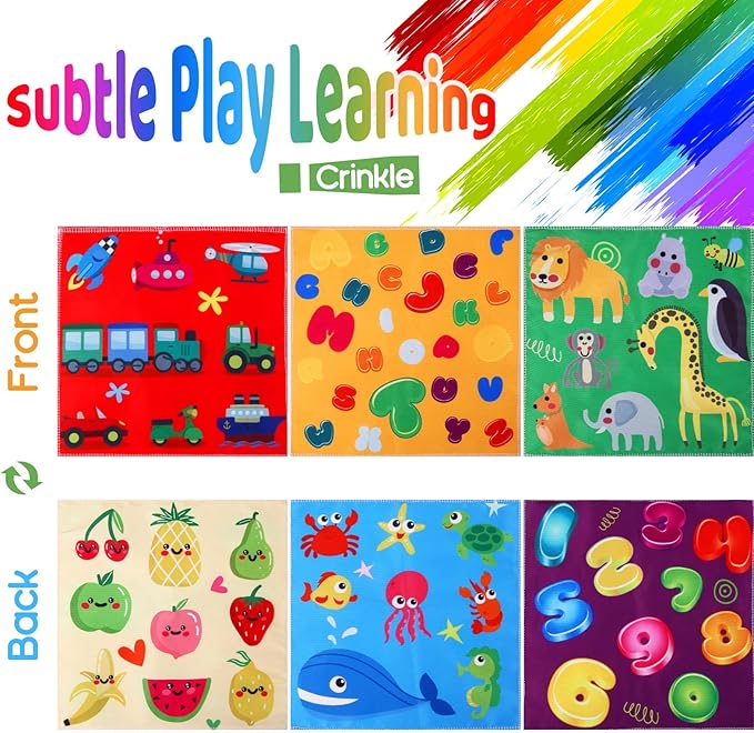 - 【✅Colorful Early Education Toys】Cute theme sensory tissue box toy for 6 to 36 months baby. We've designed 6 adorable graphic themes for toddler learning activities,including alphabets, numbers, animal , vehicles, oceans, fruits and 8 colorful silk scarves ,developing the skills of learning colors,numbers and alphabets, and enhancing cognitive.Babies will be attracted by this bright and creative interactive sensory toys box.