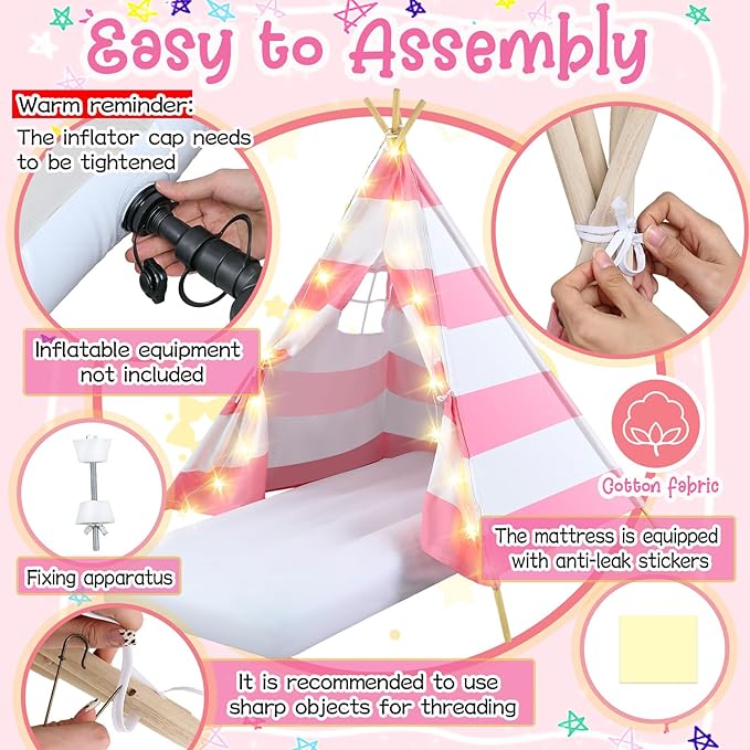 - You Will Receive: 2 kids teepee tents with pink and white stripe, 2 strings of 9.84 feet/ 3 meter star lights, 2 white air beds with a size of 61.81 x 25.98 x 7.09 inches/ 157 x 66 x 18 cm, 2 pieces of white fitted sheets that fit perfectly on the air mattress; Together these will add fun to your child's sleepover party