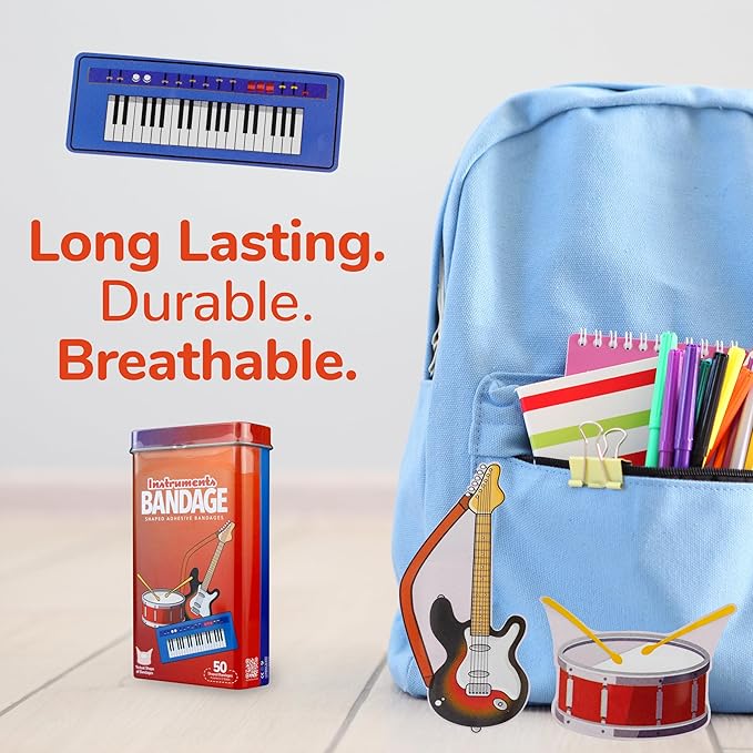 - MUSICAL INSTRUMENT BANDAGES: This 50 piece tin of Music Instrument bandages feature fun electric guitar, keyboard, and drums shapes, and is great for putting a smile on kids' faces while protecting wounds such as cuts, scrapes, and burns; sticky bandages come in a cute cardboard box and are perfect for kids and adults alike, and also for school nurses and pediatric doctors