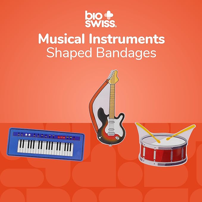 BioSwiss Bandages, Musical Instruments Shaped Self Adhesive Bandage, Latex Free Sterile Wound Care, Fun First Aid Kit Supplies for Kids and Adults, 24 Count