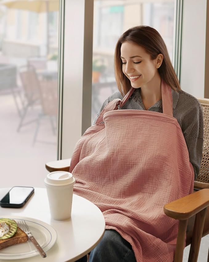 Blissful Diary Muslin Nursing Cover for Breastfeeding, Breathable Breastfeeding Cover up with Arch Neckline for Women, Nursing Apron (Dusty Pink)