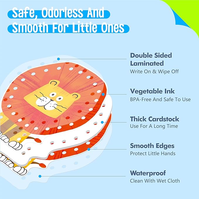 - Premium Material: The lacing cards are made of sturdy cardstock, durable and handy. Printed with premium plant ink, non-toxic and no odd smell, safe enough for toddlers’ use. The laces are made of quality polyester, which is not simple to break, and can serve you for a long time.