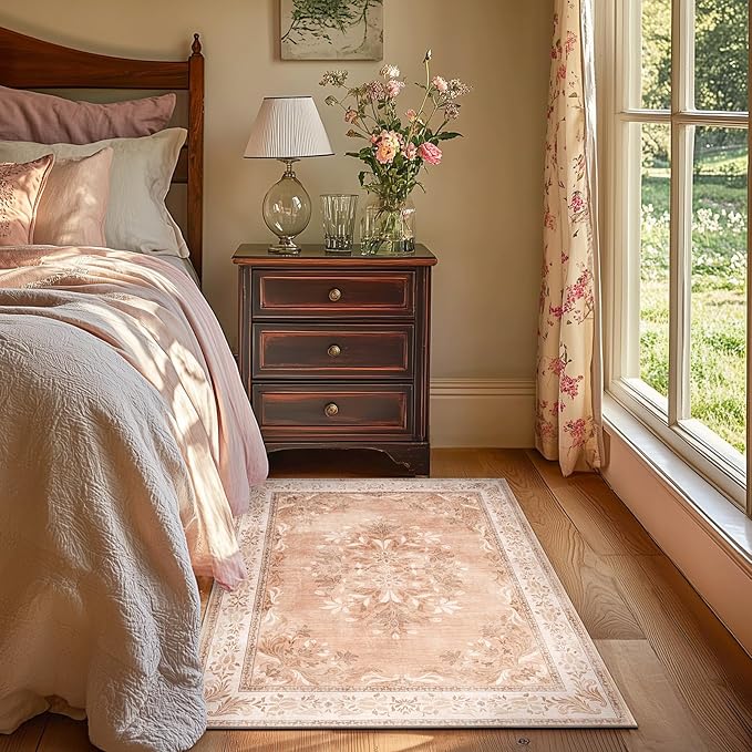 jinchan Vintage Floral 3x5 Area Rugs for Entryway - Machine Washable Distressed Design Ultra-Thin Low-Pile Soft Non-Shedding Carpet for Kitchen Bedroom Entrance Laundry Living Room (3x5ft,Coral Pink)