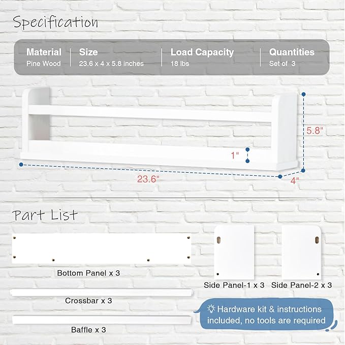 - [Premium Material and Easy to Install] These white nursery book shelves are made of solid pine wood (real pine) with advanced manufacturing processes. The package included all mounting hardware and a clear installation manual. You will easily be able to assemble those nursery wall shelves within minutes. The durable nursery shelves can hold up to 18 lbs.