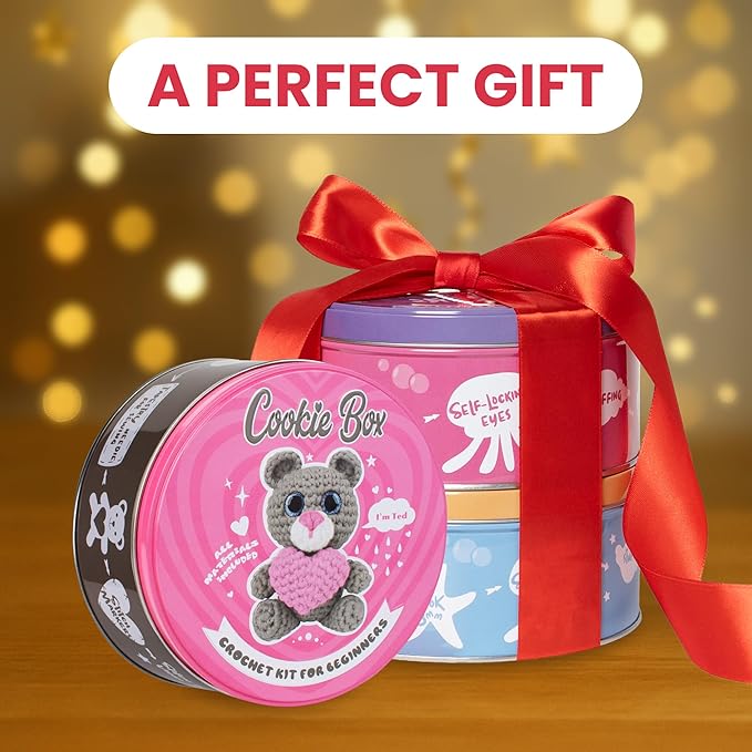 Cookie Box Crochet Kit for Beginners - Learn to Craft Amigurumi Stuffed Animals - Knitting Gift for Kids and Adults - Beginner-Friendly Yarn - Stitch-by-Stitch Video Tutorial - Bear Ted