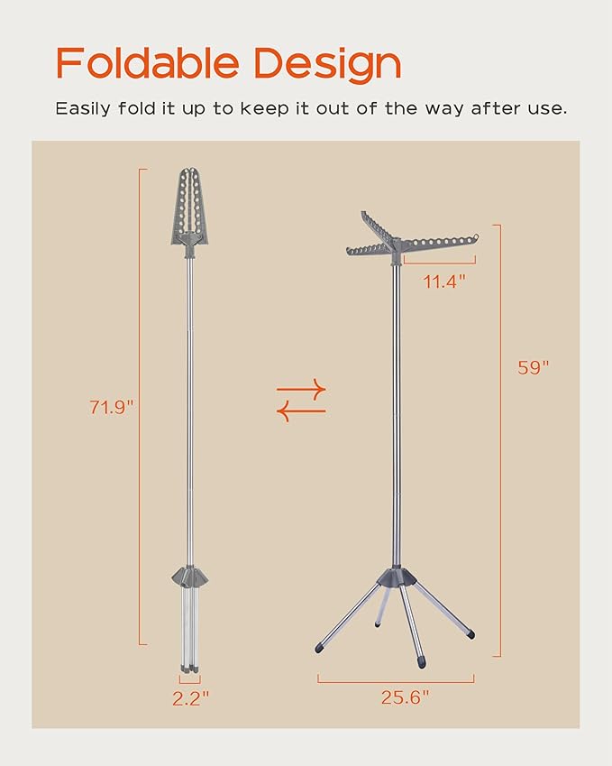 - [Foldable and Space-Saving] This vertical drying rack measures 25.6”D x 25.6”W x 59”H and takes up very little space. After use, simply fold the four legs and three drying rods into a smaller size: 2.2 "D x 2.2 "W x 71.H, which can be leaned against the footrest, perfect for apartment laundry rooms or narrow spaces and corners.