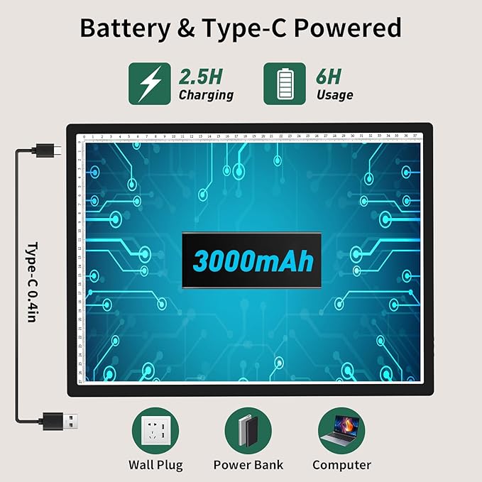 - <๐๐ฎ๐๐๐ฒ๐ฟ๐ ๐ฃ๐ผ๐๐ฒ๐ฟ๐ฒ๐ฑ ๐๐ฒ๐๐ถ๐ด๐ป>: The cordless light drawing pad boasts a rechargeable battery, delivering up to 4 hours of uninterrupted usage with just a single 2.5-hour charge. This functionality elevates the light pad's mobility, empowering users to engage in work or creativity even in settings devoid of power sources. Its portability renders it perfect for outdoor sketching or scenarios where power outlets are scarce. The absence of cords translates to reduced clutter and heightened convenience in your workspace.