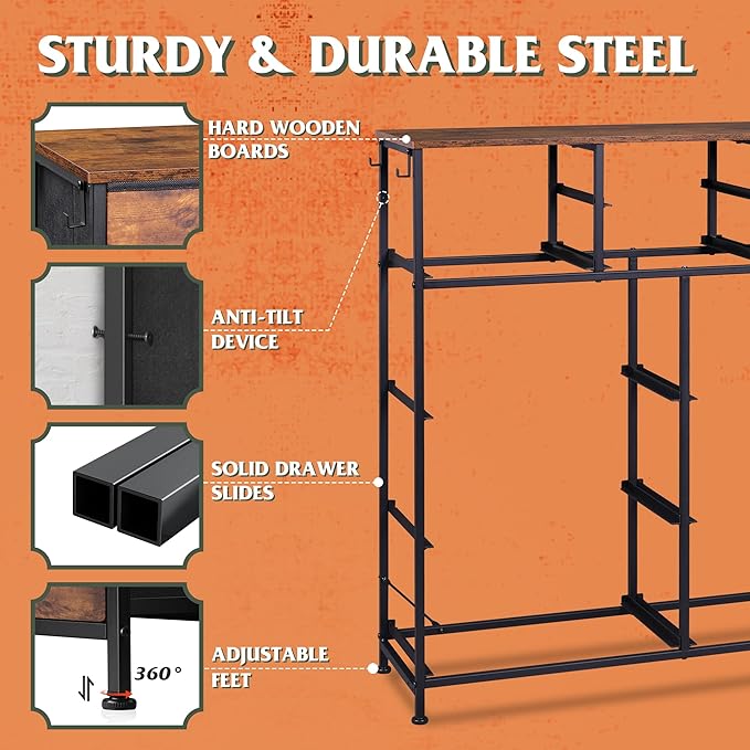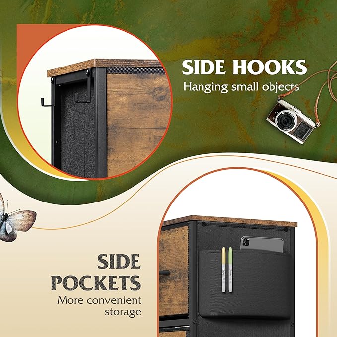 - ✅【Stylish and Versatile】 The furniture is made of sturdy steel frame support, MDF wooden waterproof countertop, and premium non-woven fabric. The back is reinforced with tension bars to enhance overall stability, making the drawer very easy to slide in and out and align correctly. Ensure safe and worry free use. The wooden top can bear up to 70 pounds, providing a sturdy surface for items such as televisions or display vases, lights, and books.