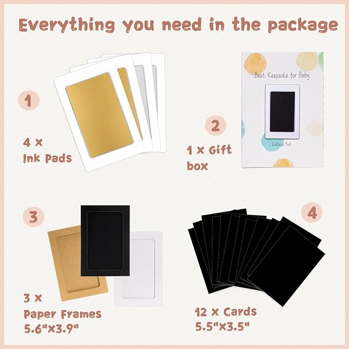 • 【Product Details】: Our baby hand and footprint kit measures 5.0"x3.2" with an ink window of 3.7"x2.3", which is the best size for recording hand and footprints of newborns 0-6 months old or pet paw prints . The ink pad for baby hand and footprints includes 4 clean touch ink pads, 12 stamping cards, and 3 display frames, ensuring you have ample opportunity to capture the best stamp.