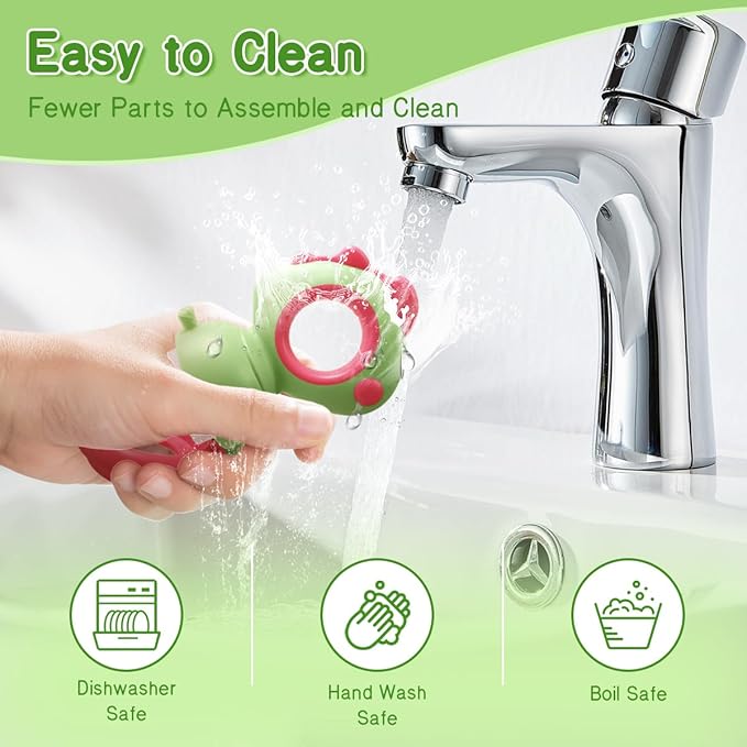 - [Effortless Hygiene] Prioritizing cleanliness and ease, our fresh fruit feeder is designed for simple dismantling and cleaning. Dishwasher safe for convenience, it can also be easily rinsed without any inaccessible spots. Microwave and boil safe, it ensures thorough sterilization for your baby's well-being.