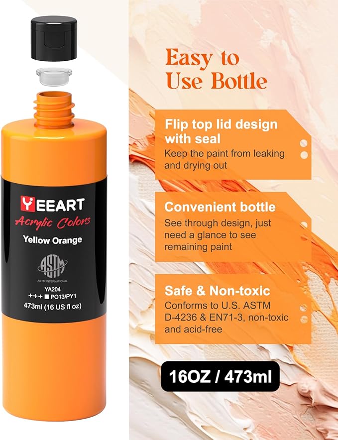 - 12 COLORS LARGE BULK ACRYLIC PAINT: This acrylic paint set contains 12 vibrant colors in large volume-473ml/16 fl oz each, 192 oz paints total. Various colors to meet your creative needs and ideal for artists, beginners, kids and adults on painting and crafting
