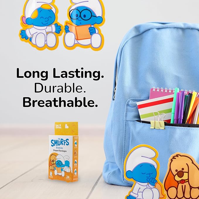 BioSwiss Bandages, The Smurfs Baby Smurf Shaped Self Adhesive Bandage, Latex Free Sterile Wound Care, Fun First Aid Kit Supplies for Kids and Adults, 24 Count Box