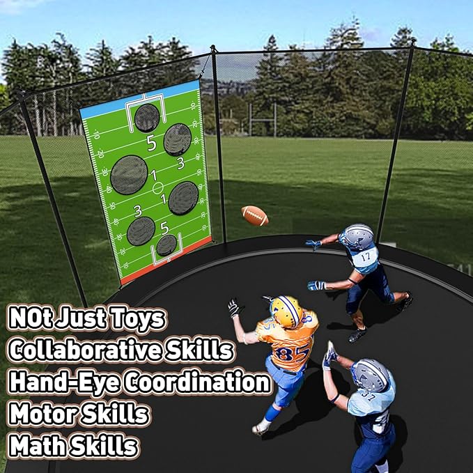 jumpfly Trampoline Football Game Accessories, Toss Throwing Target Net Fits 8 FT/10 FT/12 FT/14 FT Recreational Trampolines with Two Footballs - Trampoline Indoor Outdoor Party Games for Kids
