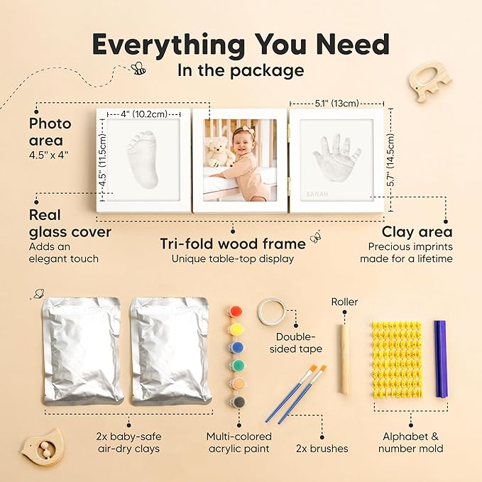 - 100% Safe Food-Grade Clay - Our baby picture frame features 100% baby-safe air-dry clay, perfect for preserving your baby prints. Our premium material ensures durability, the baby handprint and footprint maker will look flawless for years to come.