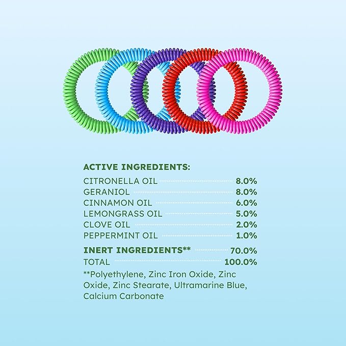 - Natural Plant Ingredients & DEET-Free Our mosquito bracelets are made with Geraniol Oil, Lemongrass Oil, and Citronella Oil, offering a natural and DEET-free mosquito repellent solution. Keep your family safe with effective protection from mosquito bites.