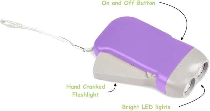 - 🦉FLASHLIGHT - with bright LED lights. Simple hand cranked function recharges in-built batteries so no additional batteries or charging required, the compact size and wrist strap make it perfect for camping, sleepovers and backyard nighttime adventures.