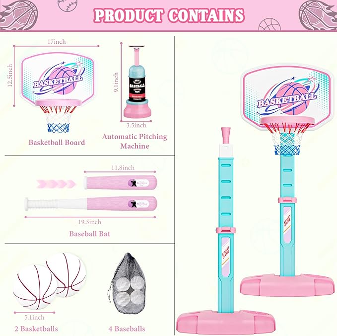 - 【MULTIPLE WAYS TO PLAY】①Basketball Hoop: Equipped with 2 high-elastic basketballs to make playing basketball more fun. ②Baseball Tee Stand: Ideal for helping little girls practice batting skills and improve hand-eye coordination. ③Automatic Launcher: Baseball bounces automatically and hits the baseball quickly, making the game challenging and fun
